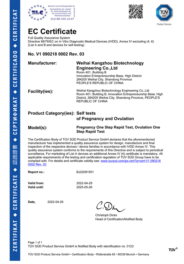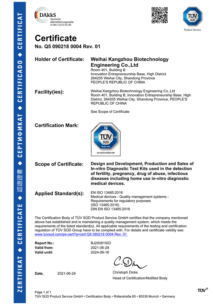 ? ? ?威海康州生物工程有限公司成立于2013年,公司坐落于風景秀麗的海濱小城——威海市。康州生物是集研發(fā)、生產(chǎn)和銷售于一體的生物科技公司,與威海哈爾濱工業(yè)大學合作研發(fā)團隊,擁有先進的科研基地及生產(chǎn)基地。主要從事快速診斷檢測產(chǎn)品的研發(fā)、生產(chǎn)、銷售。產(chǎn)品涵蓋:生育檢測、藥物濫用檢測、農藥殘留檢測以及其他臨床診斷檢測等。公司自主研發(fā)生產(chǎn)得早早孕試紙,排卵檢測試紙,毒品檢測及疾病檢測等醫(yī)用產(chǎn)品,經(jīng)過歐盟認證,產(chǎn)品質量穩(wěn)定,值得信賴。